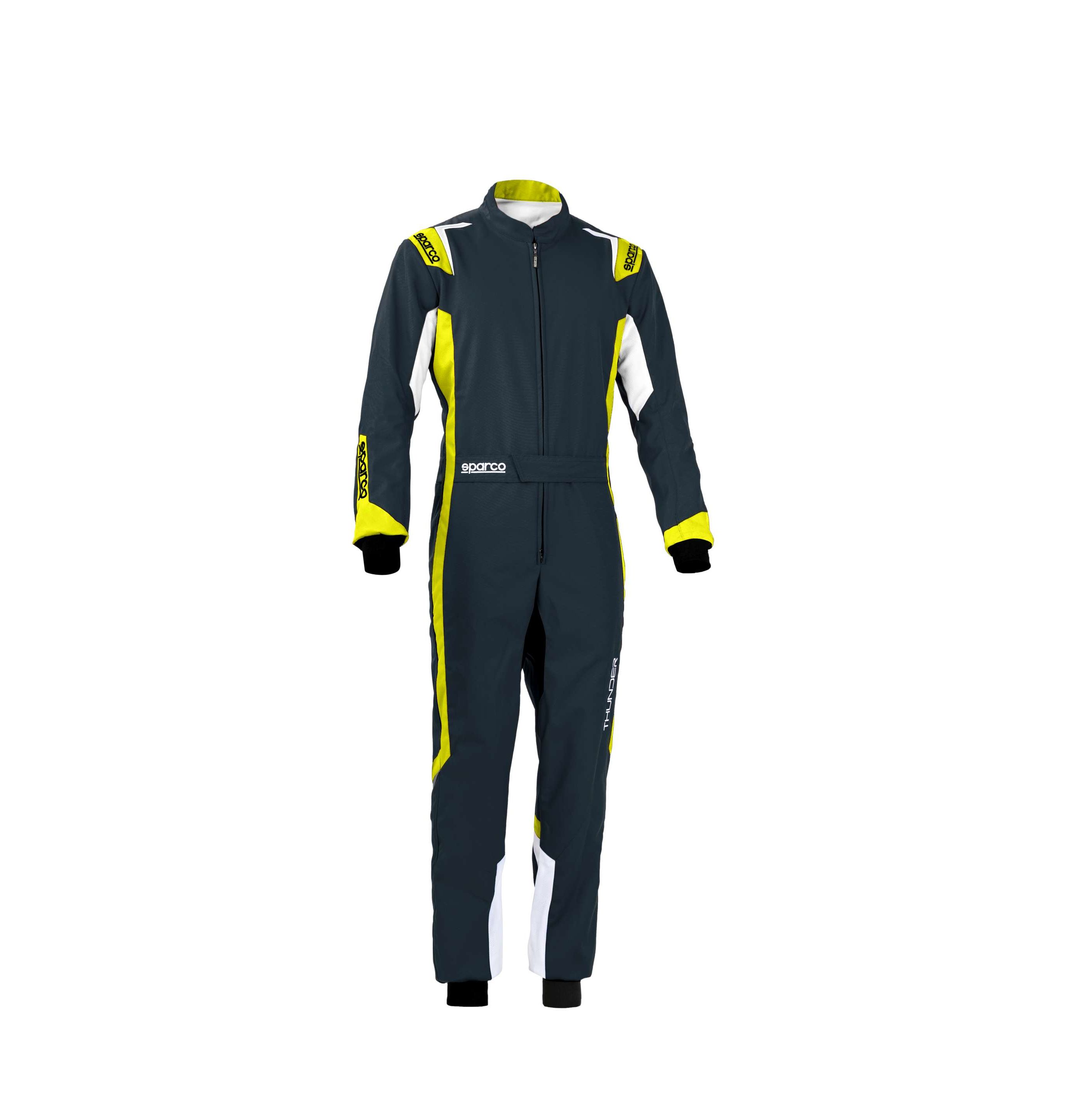 Kartingowy kombinezon SPARCO THUNDER. Gramatura materiału 500-530 g/m2. Kombinezon został wyposażony w elastyczny panel na plecach, ukryte kieszenie boczne, oddychające wstawki na nogawkach, pas zapinany na rzep oraz ściągacze na nogawkach i rękawach. Kombinezon dostępny w sześciu wariantach kolorystycznych. Kartingowa homologacja CIK-FIA N2013.1.