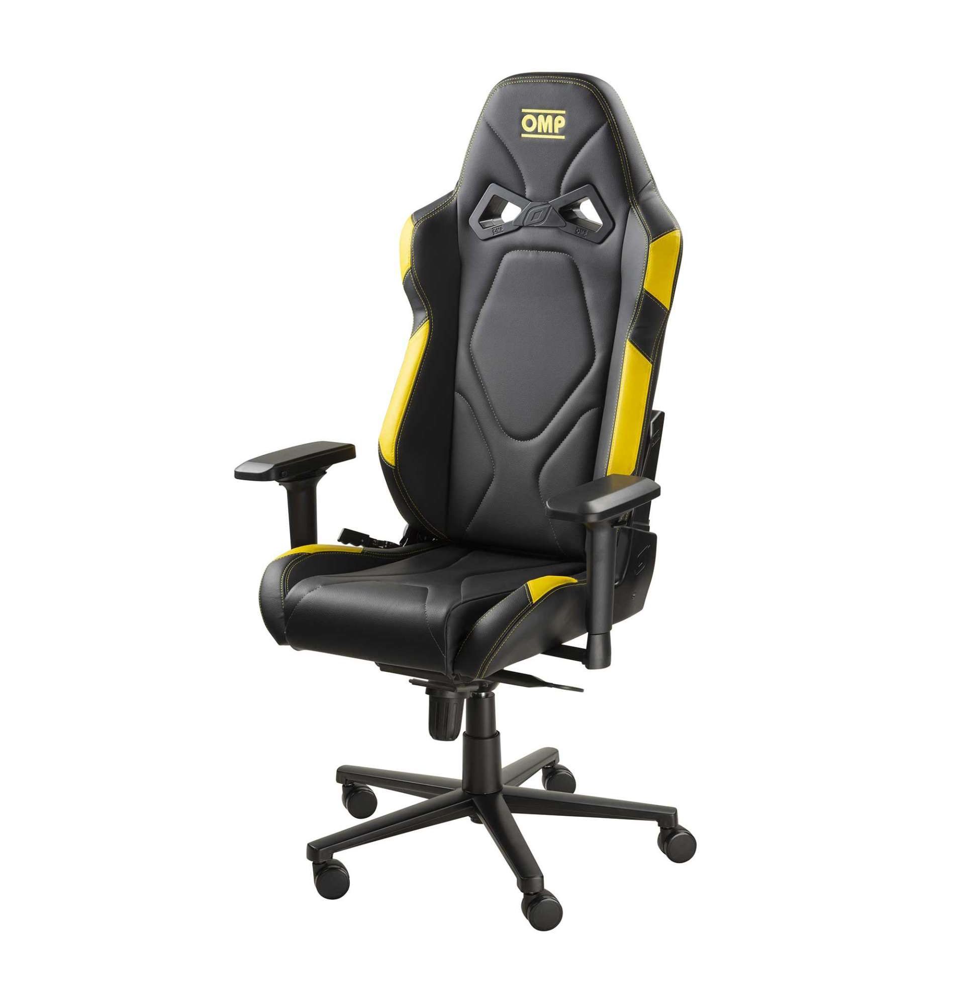 Obrotowy fotel biurowy OMP GS, wzorowany na sportowych fotelach samochodowych, z homologacją UNI EN 1335-2020 (standard dla foteli biurowych). Tapicerka wykonana z winylu z nowoczesnymi przeszyciami 3D, baza na kółkach wykonana z aluminium. Fotel posiada regulację nachylenia oparcia, wysokości siedziska oraz podłokietników. Zdejmowana poduszka lędźwiowa w komplecie.