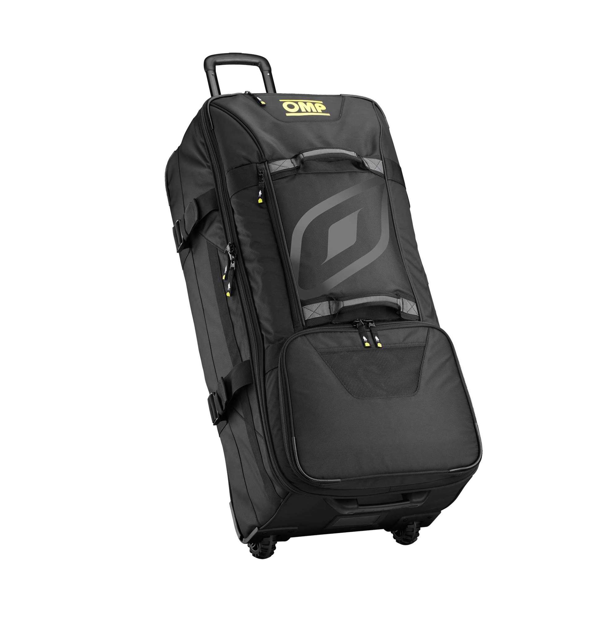 Duża torba podróżna OMP LARGE TROLLEY. Wykonana z odpornego i lekkiego materiału, wyposażona w kółka, wygodny i wysuwany uchwyt, zdejmowaną przegródkę, oraz liczne kieszenie. Znakomita do przewożenia kasku, kombinezonu oraz innych akcesoriów. Wymiary 42x36x92 cm, pojemność 145 litrów.