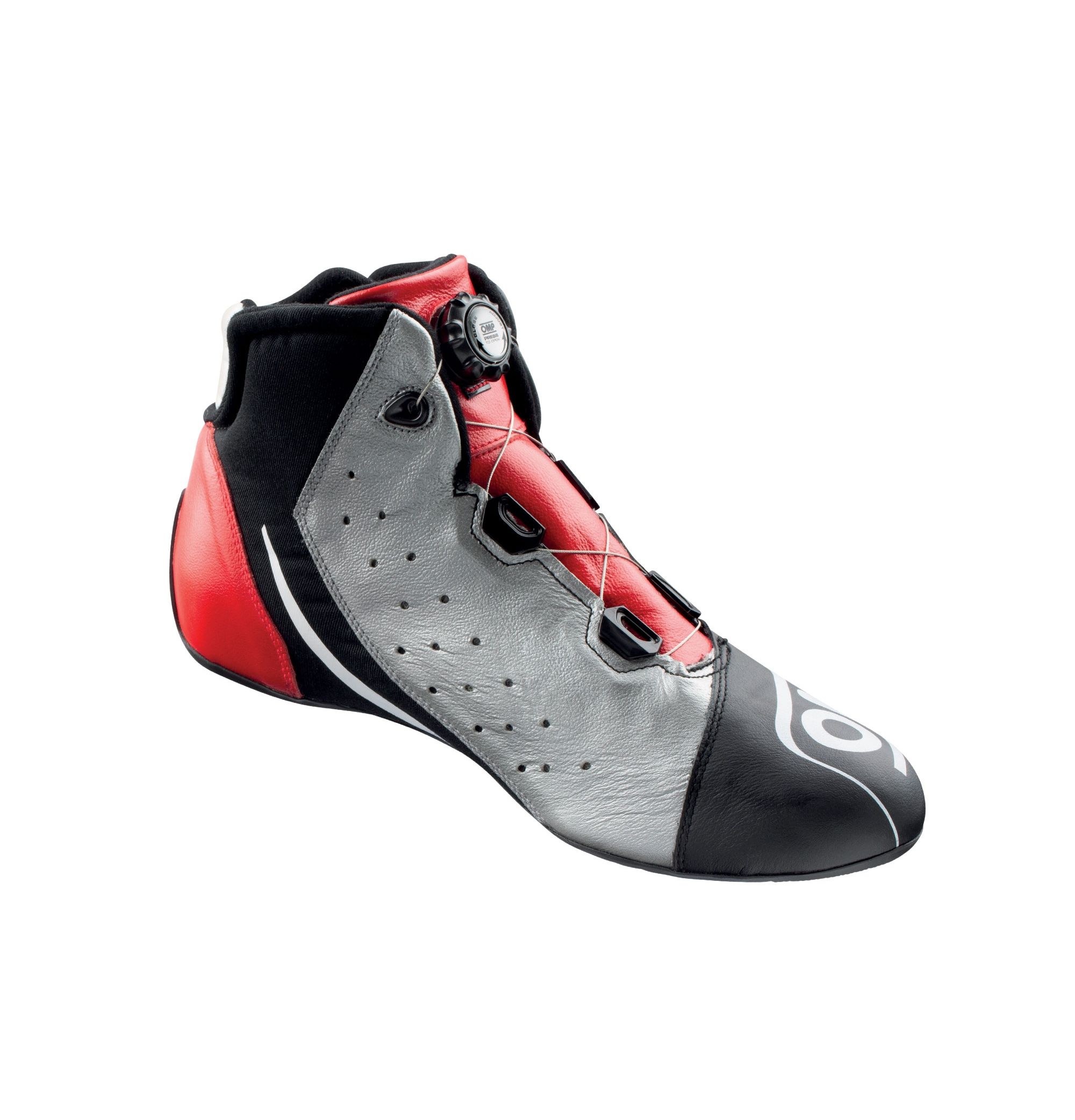 OMP One Evo X R to nowa, odświeżona wersja topowego modelu butów rajdowych One Evo Formula R. Wykonane z niezwykle miękkiej i lekkiej skóry kangura, dziurkowane po bokach dla lepszej wentylacji. Wyposażone zostały w specjalny system sznurowania ROTOR-LACING, umożliwiający perfekcyjne dopasowanie do stopy. Cienka podeszwa odporna na olej i benzynę została zaprojektowana tak aby zmaksymalizować wyczucie pedałów. Homologacja FIA.
