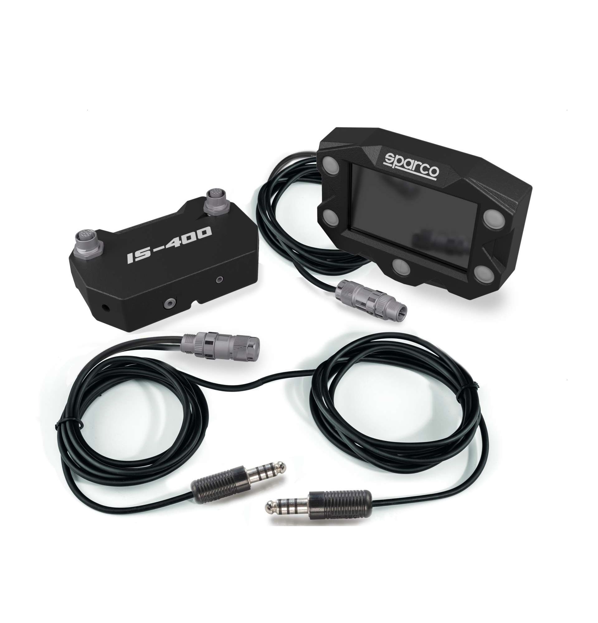 Profesjonalna, cyfrowa centralka interkomu Sparco IS-400 F z 7-calowym ekranem, pilotem oraz męskim złączem Nexus. Cechy charakterystyczne: