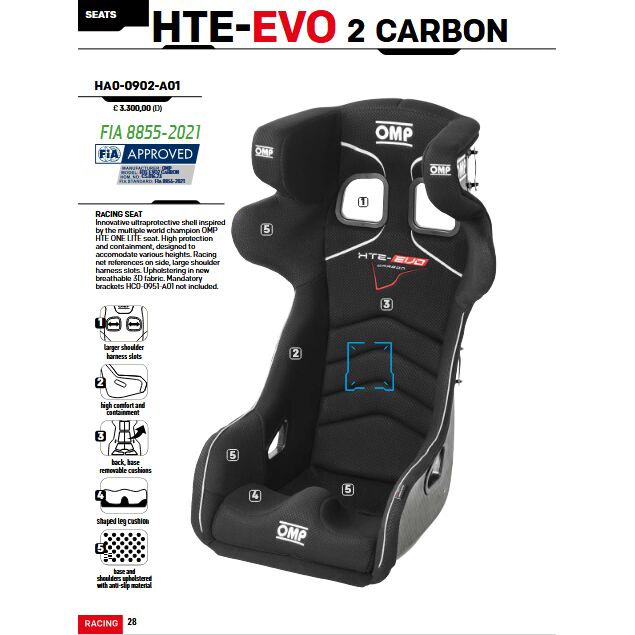 Fotel OMP HTE EVO 2 Carbon został zaprojektowany zgodnie z najnowszymi wymogami homologacji FIA 8855-2021. Ultralekka i wyjątkowo wytrzymała skorupa z włókna węglowego posiada zintegrowane podparcie głowy oraz specjalne punkty mocowania dla siatki bezpieczeństwa. Poduszki na plecach, siedzisku i pod nogami są zdejmowane, co ułatwia czyszczenie, i zostały obszyte oddychającą tkaniną 3D Airnet, która pomaga ograniczyć pocenie się. Na ramionach zastosowano materiał z wypustkami, który poprawia przyczepność i zmniejsza ruchy górnej części ciała.