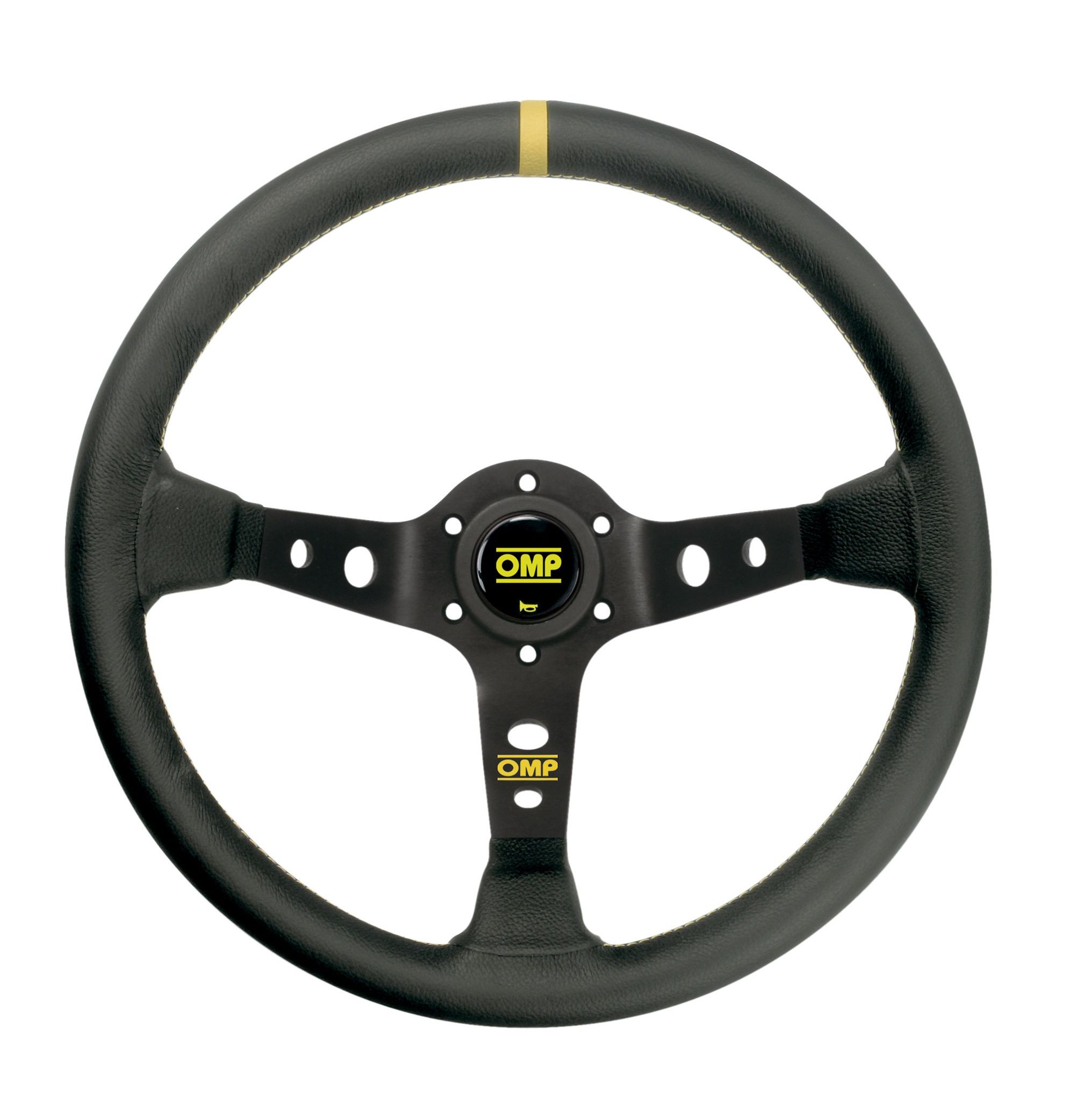 Kierownica skórzana OMP CORSICA – czarna z żółtym obszyciem, odsadzenie 95 mm. Średnica 350 mm. Uchwyt 30/28 mm. Mocowanie na 6 śrub.