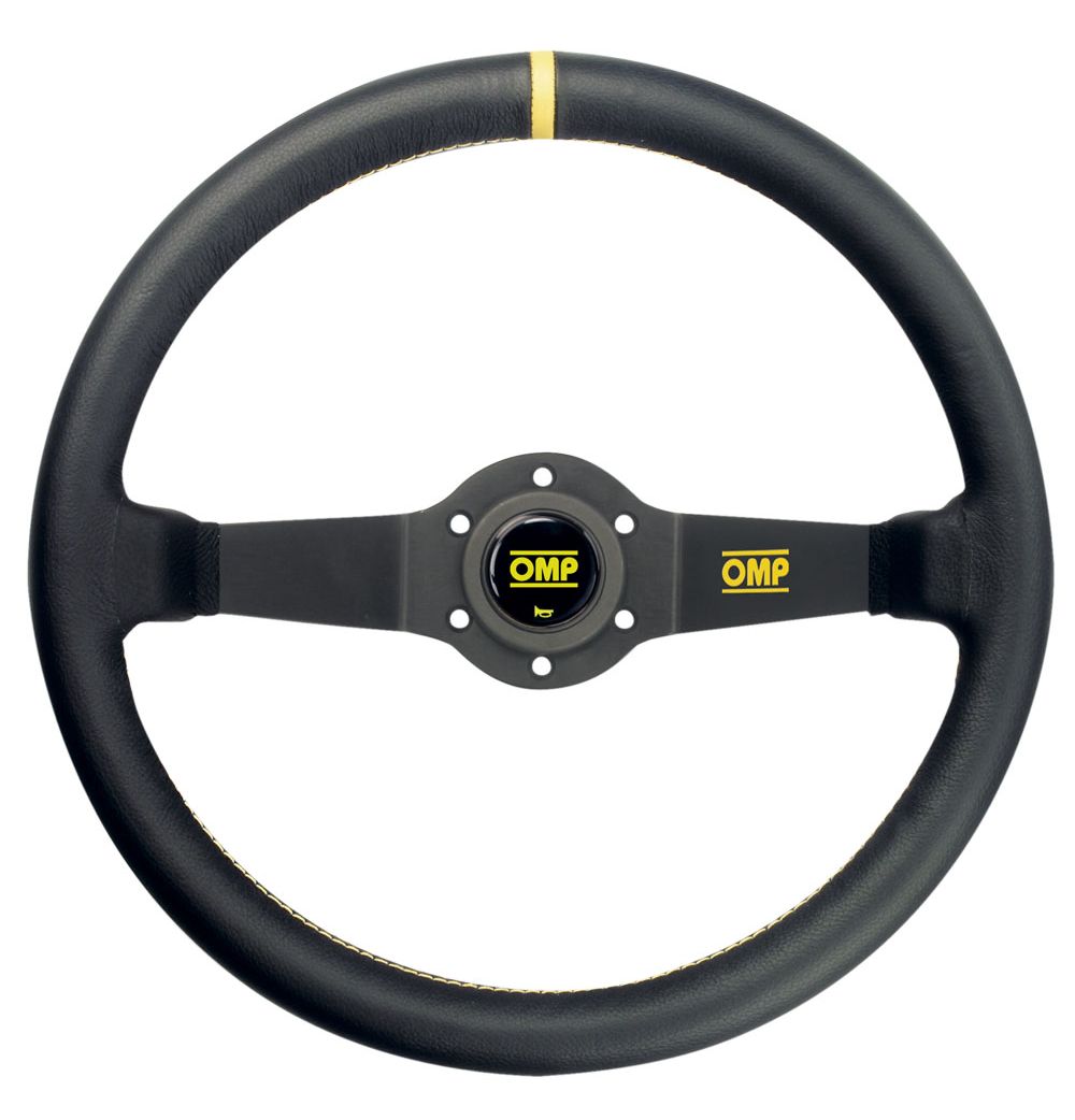 Kierownica skórzana OMP RALLY – czarna z żółtym obszyciem, odsadzenie 95 mm. Średnica 350 mm. Uchwyt okrągły 30 mm. Mocowanie na 6 śrub.