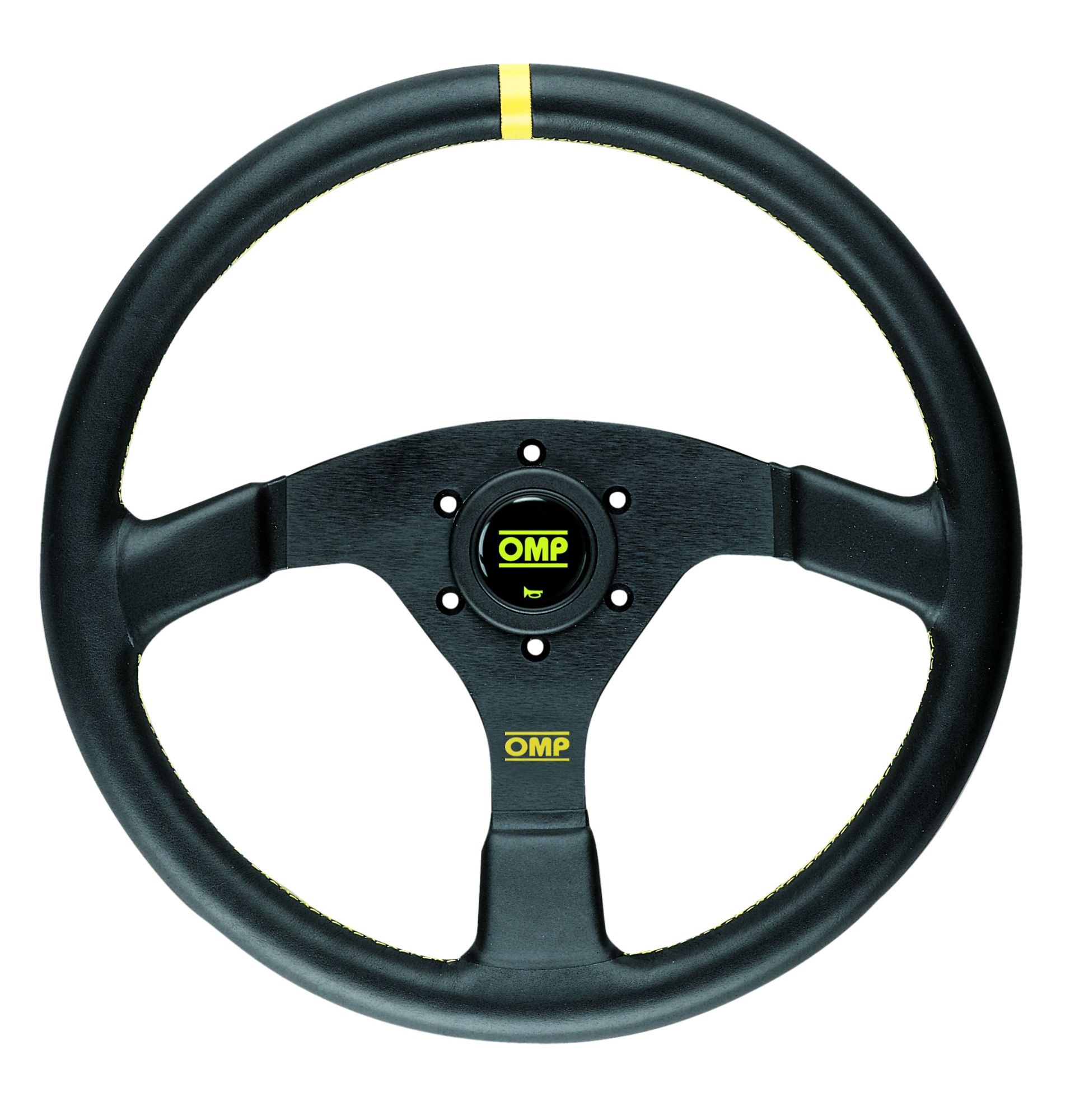 Kierownica skórzana OMP VELOCITA – czarna z żółtym obszyciem, płaska. Średnica 350 mm. Uchwyt 30/25 mm. Mocowanie na 6 śrub.