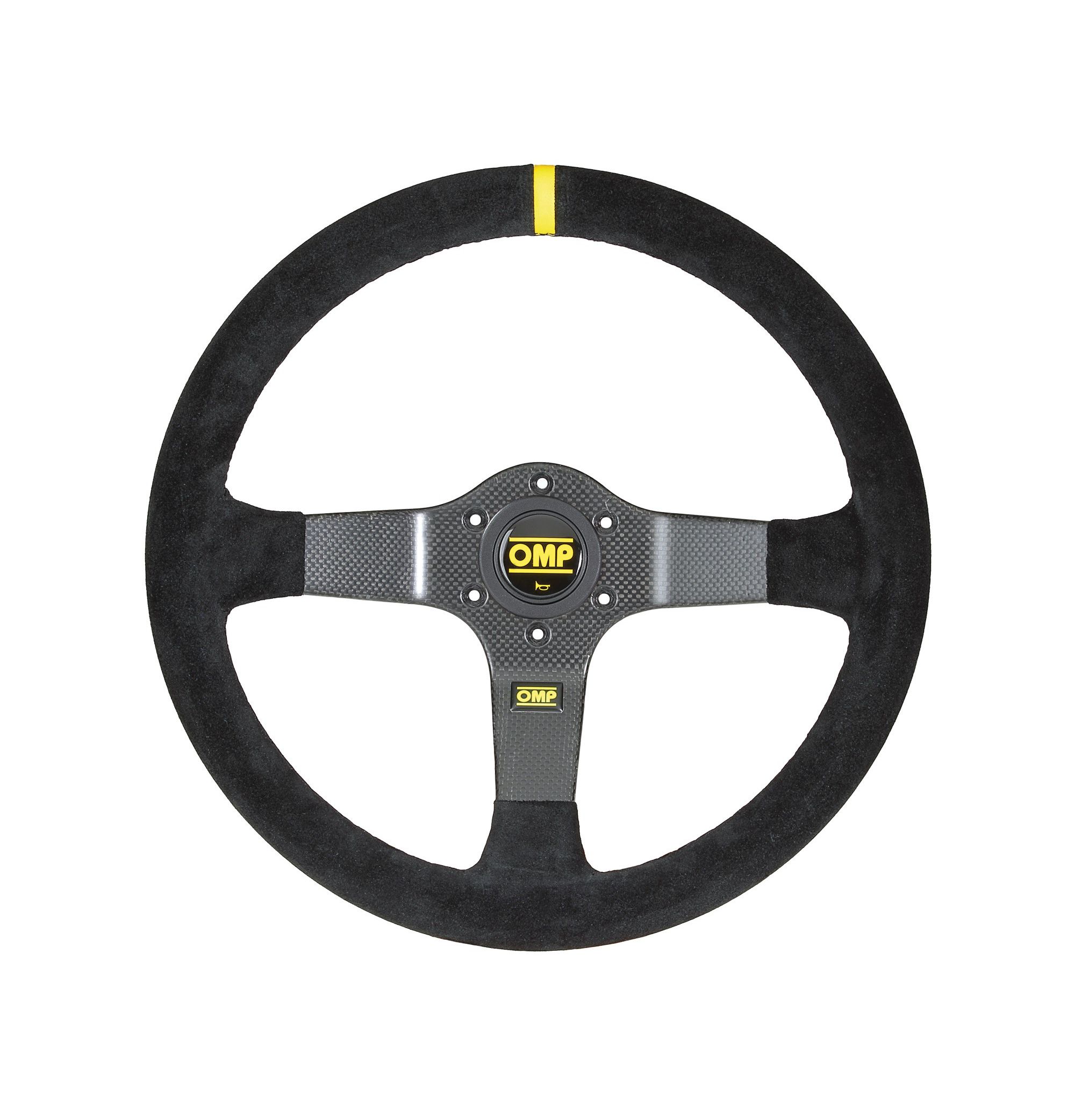 Kierownica zamszowa OMP 350 CARBON D – czarna z czarnym obszyciem. Uchwyt okrągły 30 mm. Średnica 350 mm, odsadzenie 95 mm. Karbonowa, superlekka (waga 500 gr.). Mocowanie na 6 śrub.