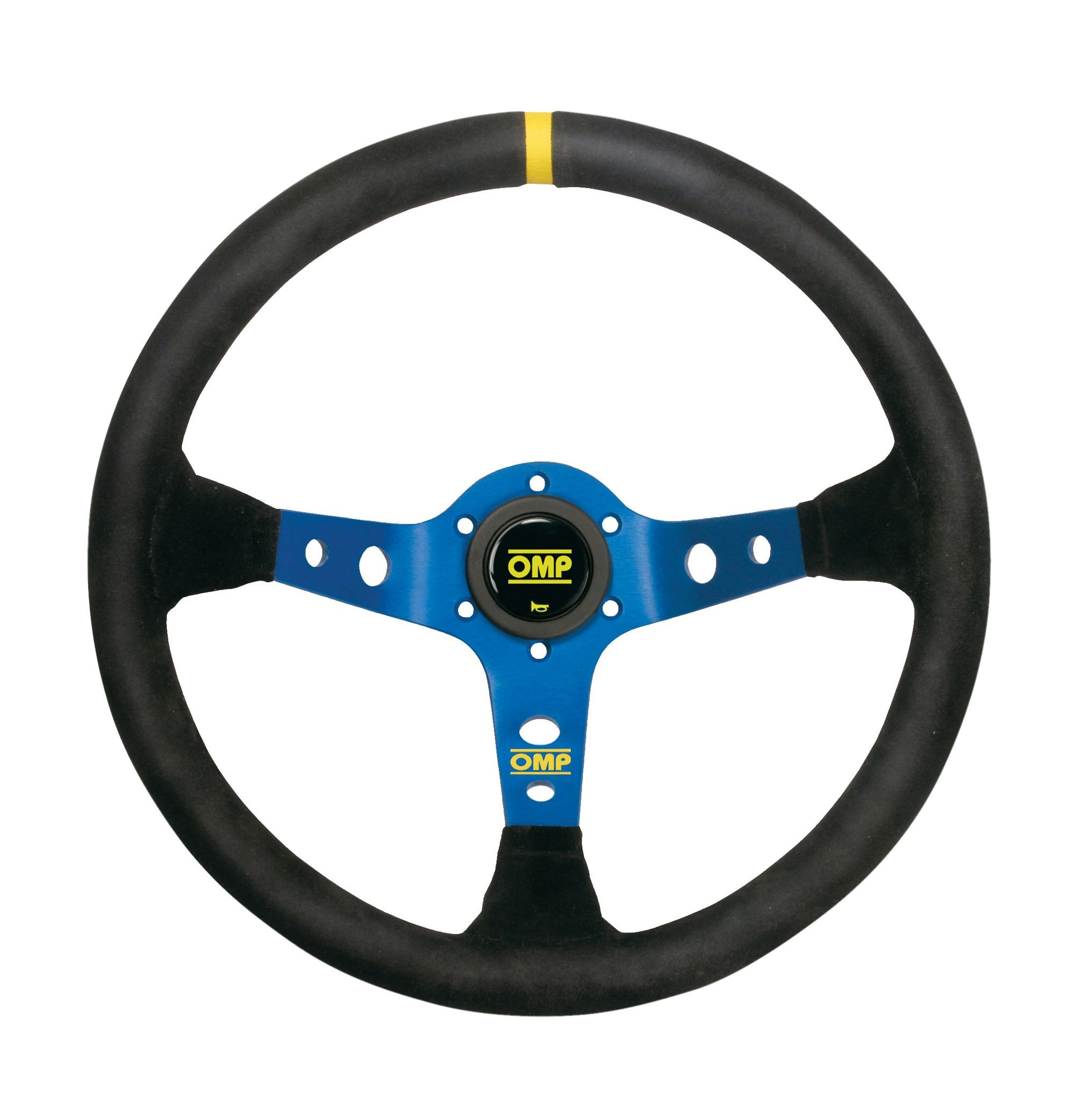 Kierownica zamszowa OMP CORSICA – czarno-niebieska z czarnym obszyciem, odsadzenie 95 mm. Średnica 350 mm. Uchwyt 30/28 mm. Mocowanie na 6 śrub.