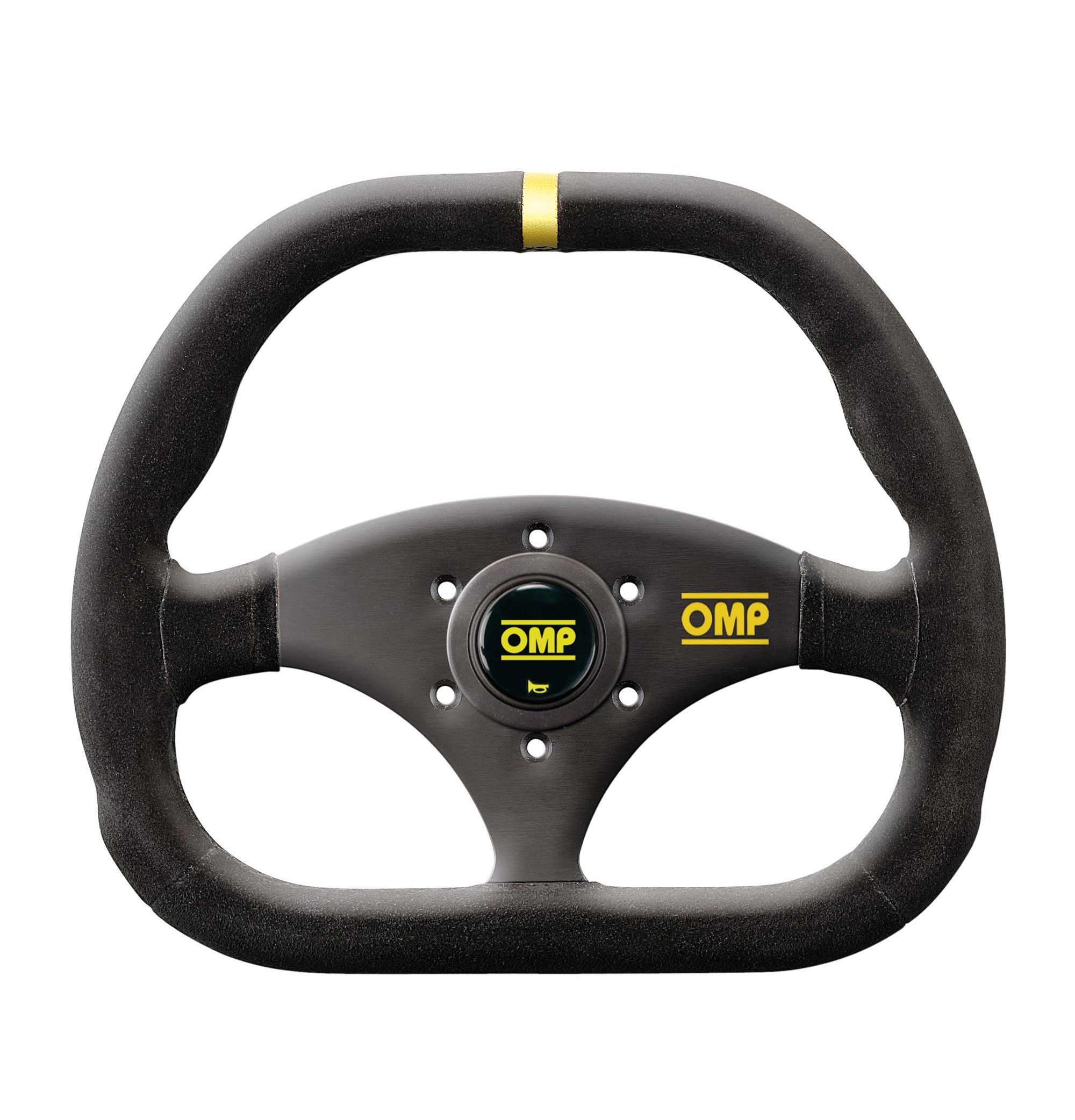 Kierownica zamszowa OMP KUBIK – czarna z czarnym obszyciem, płaska. Średnica 310/265 mm. Uchwyt 28/35 mm. Mocowanie na 6 śrub.
