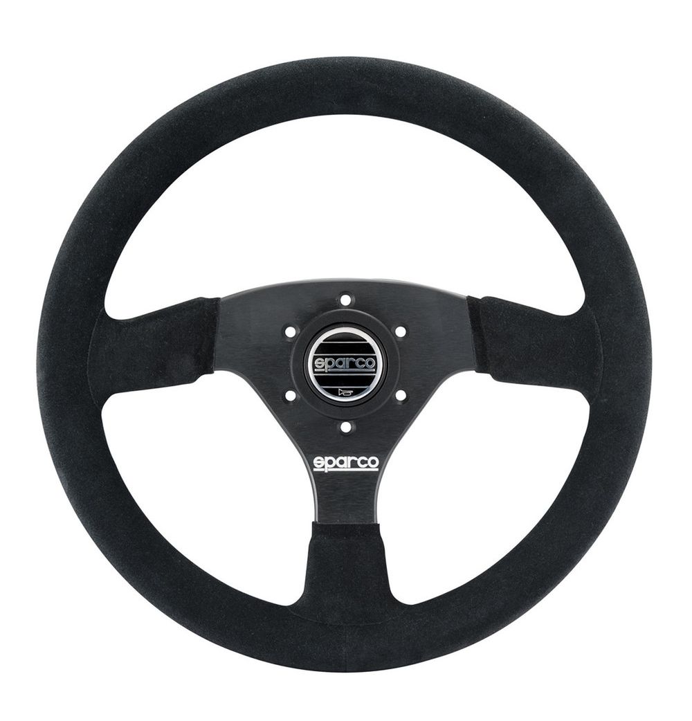 Kierownica zamszowa SPARCO R323 – czarna z czarnym obszyciem, odsadzenie 39 mm. Średnica 330 mm. Uchwyt okrągły 30 mm. Mocowanie na 6 śrub.