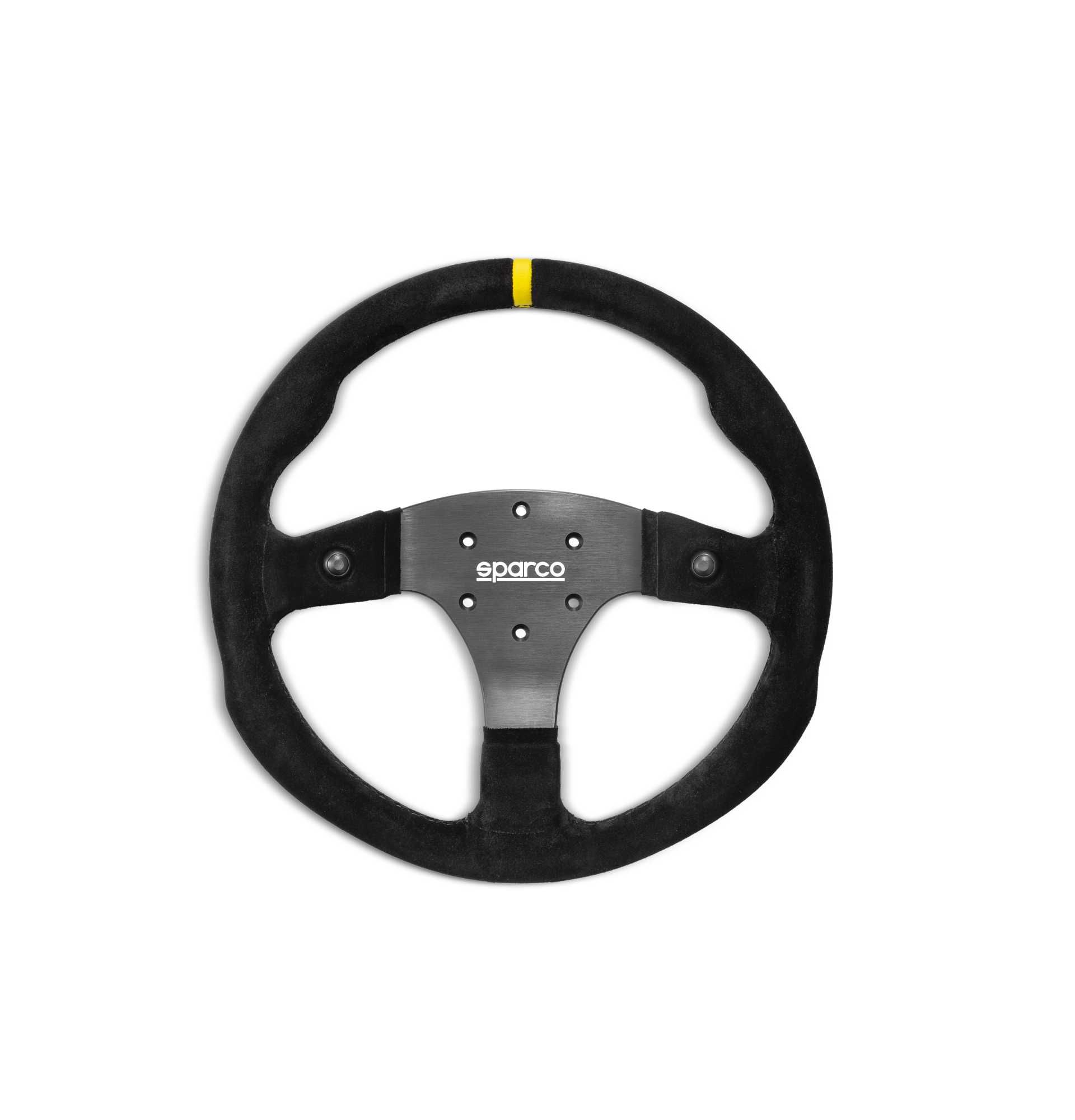 Kierownica zamszowa SPARCO R330B wyposażona w dwa przyciski umiejscowione na ramionach – czarna z czarnym obszyciem, płaska. Średnica 330 mm. Uchwyt 33/25 mm. Mocowanie na 6 śrub (rozstaw 6x70 mm). Brak klaksonu.