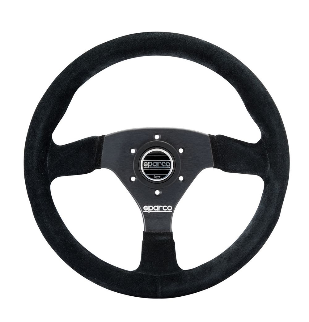 Kierownica zamszowa SPARCO R383 – czarna z czarnym obszyciem, odsadzenie 39 mm. Średnica 330 mm. Uchwyt 37/29 mm. Mocowanie na 6 śrub.