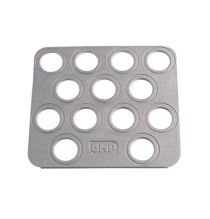 Aluminiowe oparcie stóp pilota / podstopnica OMP. Wymiary: 320x280 mm, kolor srebrny. Zestaw stalowych śrub w komplecie.