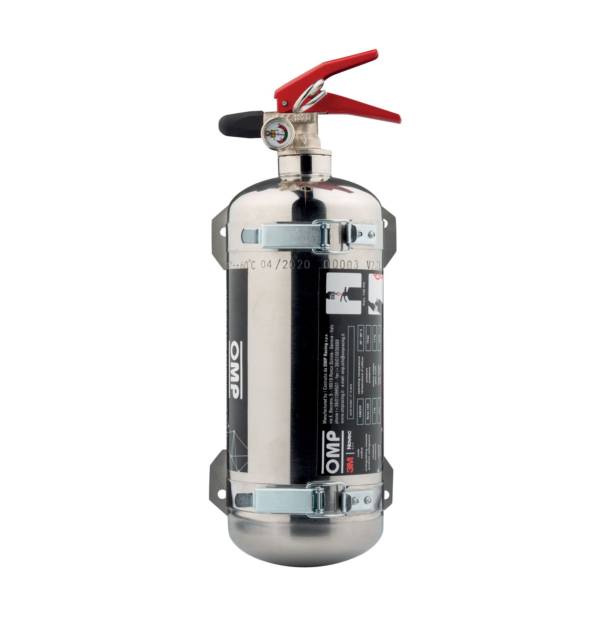 Gaśnica ręczna OMP CAB/323. Stalowa butla o średnicy 110 mm i długości 285 mm. Całkowita długość gaśnicy 360 mm, waga 3,15 kg. Środek gaśniczy 3MTM NovecTM 1230 (2 kg). Produkt wyprodukowany we Włoszech, zgodny z przepisami FIA (załącznik "J" art. 253).