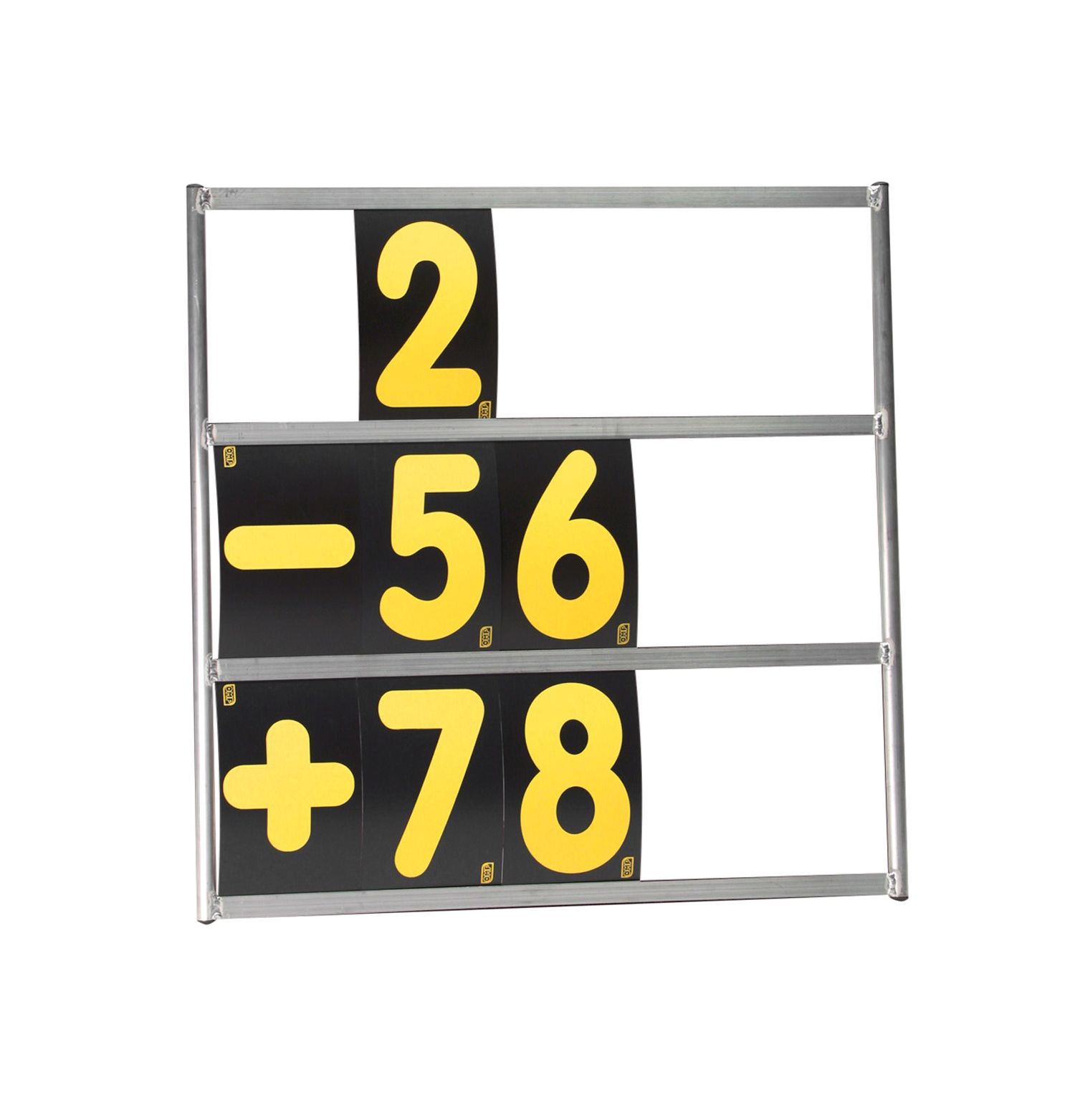 Aluminiowa tablica wyników OMP Tripla. Wymiary 72x72 cm, 3 rzędy. Zestaw znaków w komplecie.