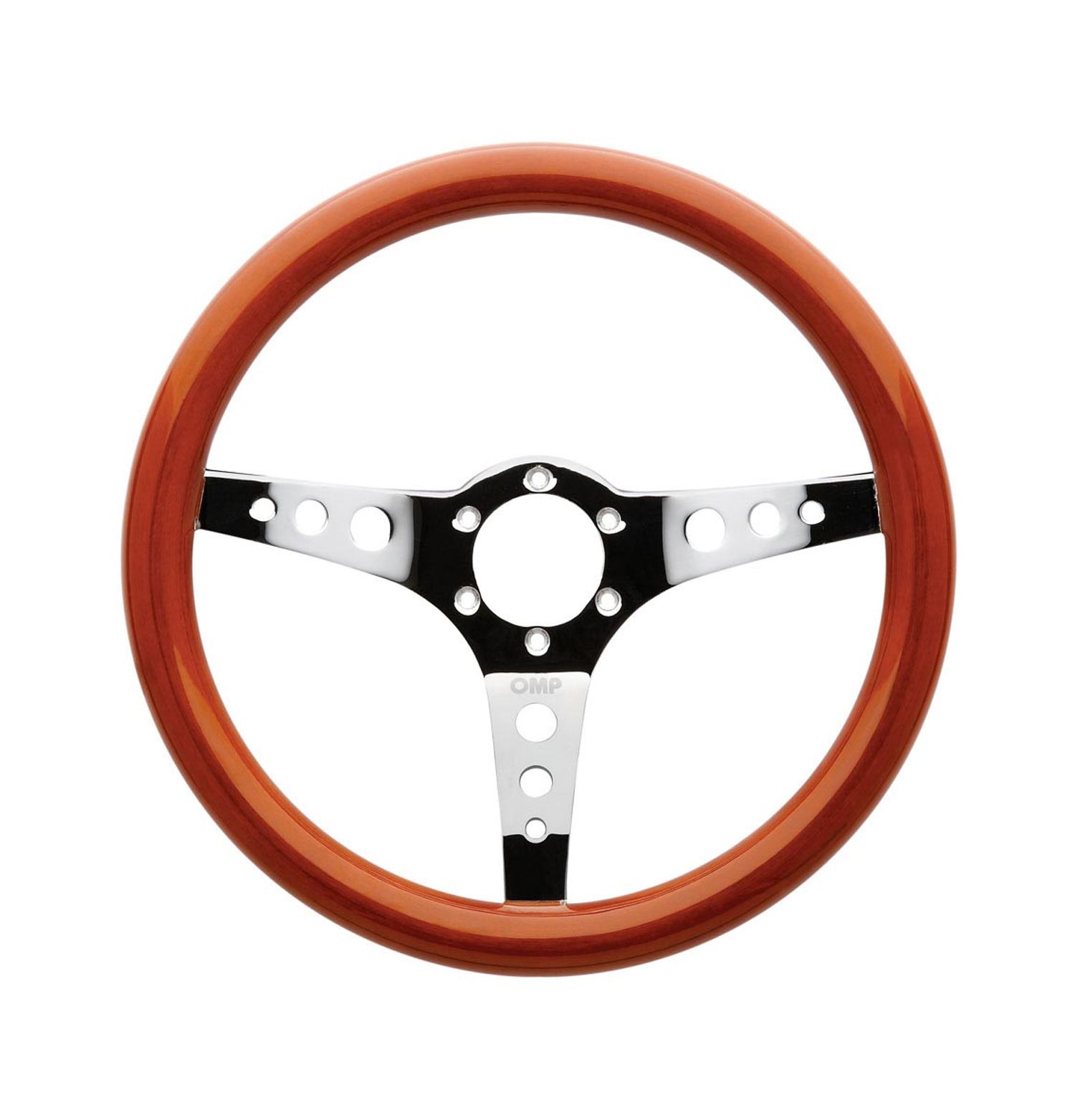 Linia Vintage. Kierownica płaska, drewniana OMP MUGELLO - średnica 350 mm, uchwyt okrągły 30 mm, mocowanie na 6 śrub.