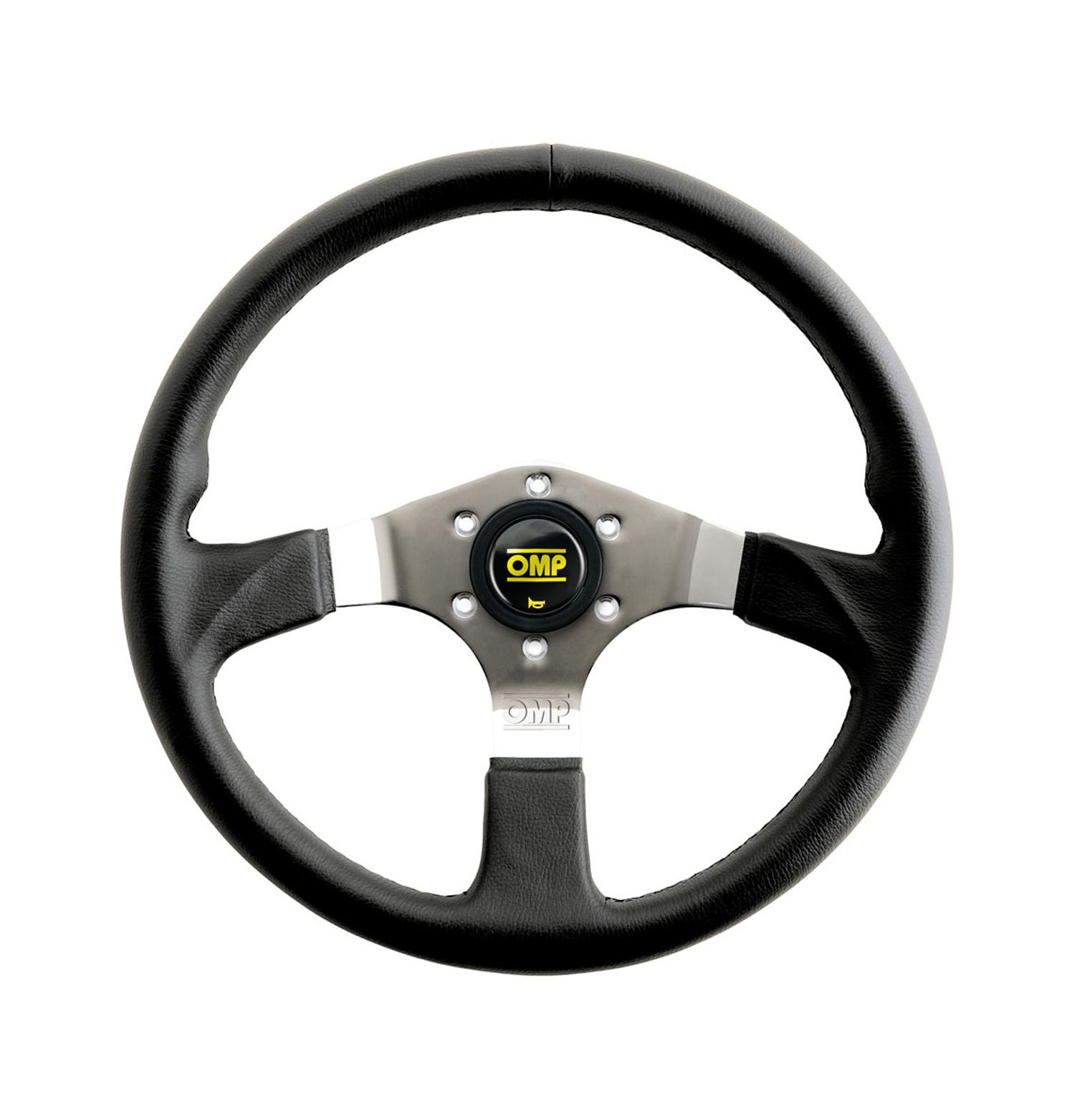 Kierownica skórzana OMP ASSO – czarna z czarnym obszyciem, płaska. Średnica 350 mm. Uchwyt 27/35,5 mm. Mocowanie na 6 śrub.