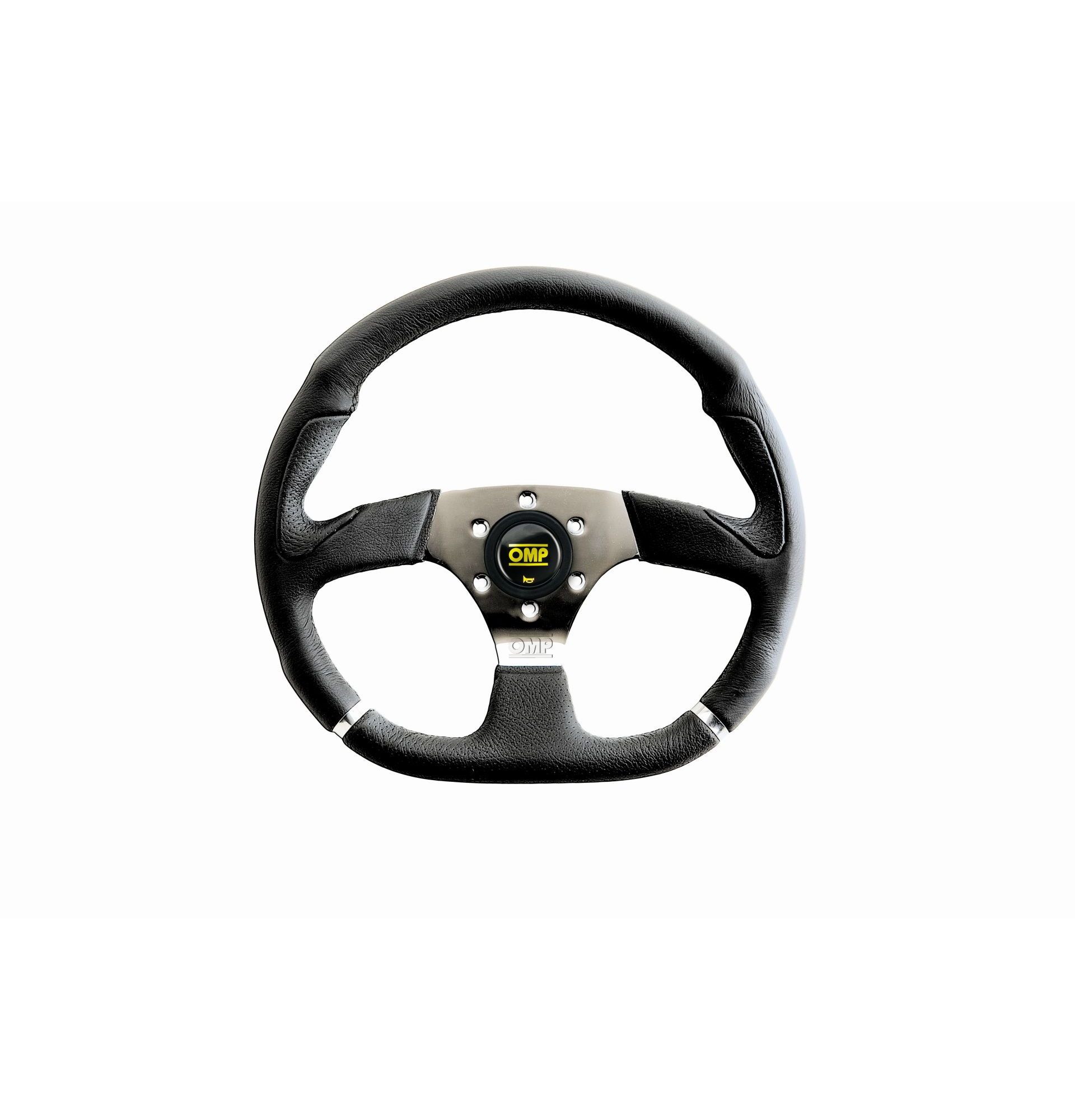 Kierownica skórzana OMP CROMO, wstawki ze skóry perforowanej. Czarna z czarnym obszyciem, płaska. Średnica 350/330 mm. Uchwyt 27/32 mm. Mocowanie na 6 śrub.