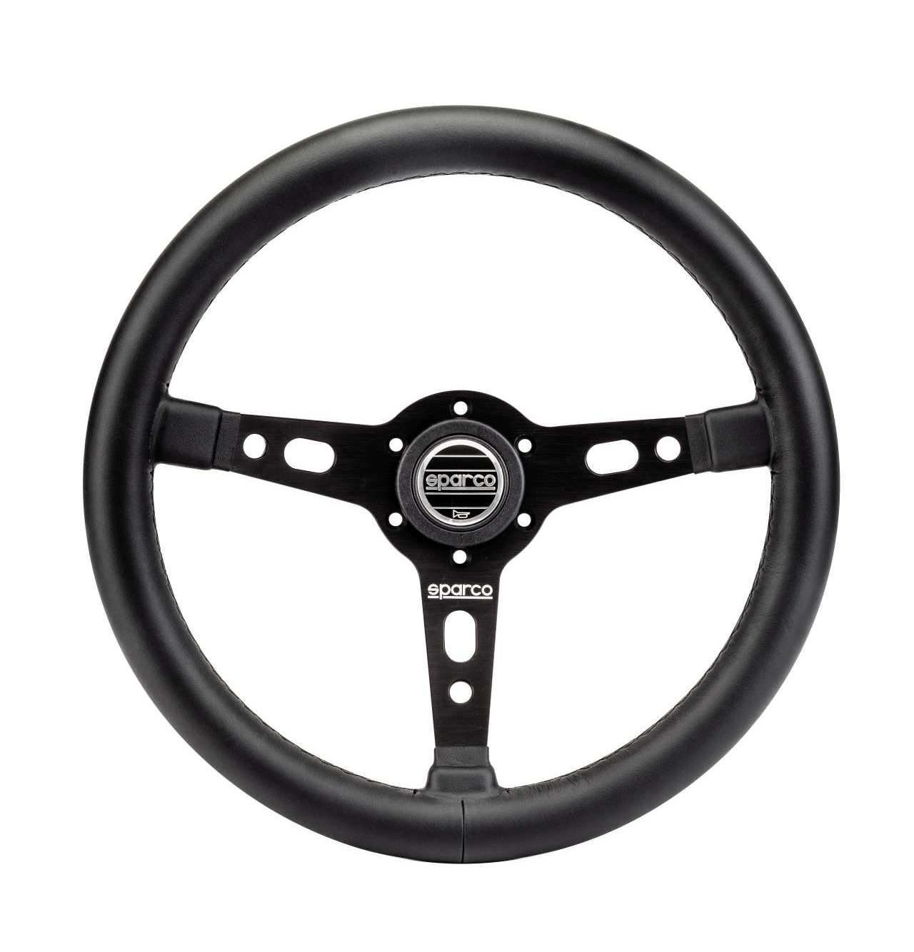 Kierownica skórzana SPARCO TARGA 350, czarna z czarnym obszyciem. Odsadzenie 65 mm, średnica 350 mm. Uchwyt owalny 37/29 mm. Mocowanie na 6 śrub.