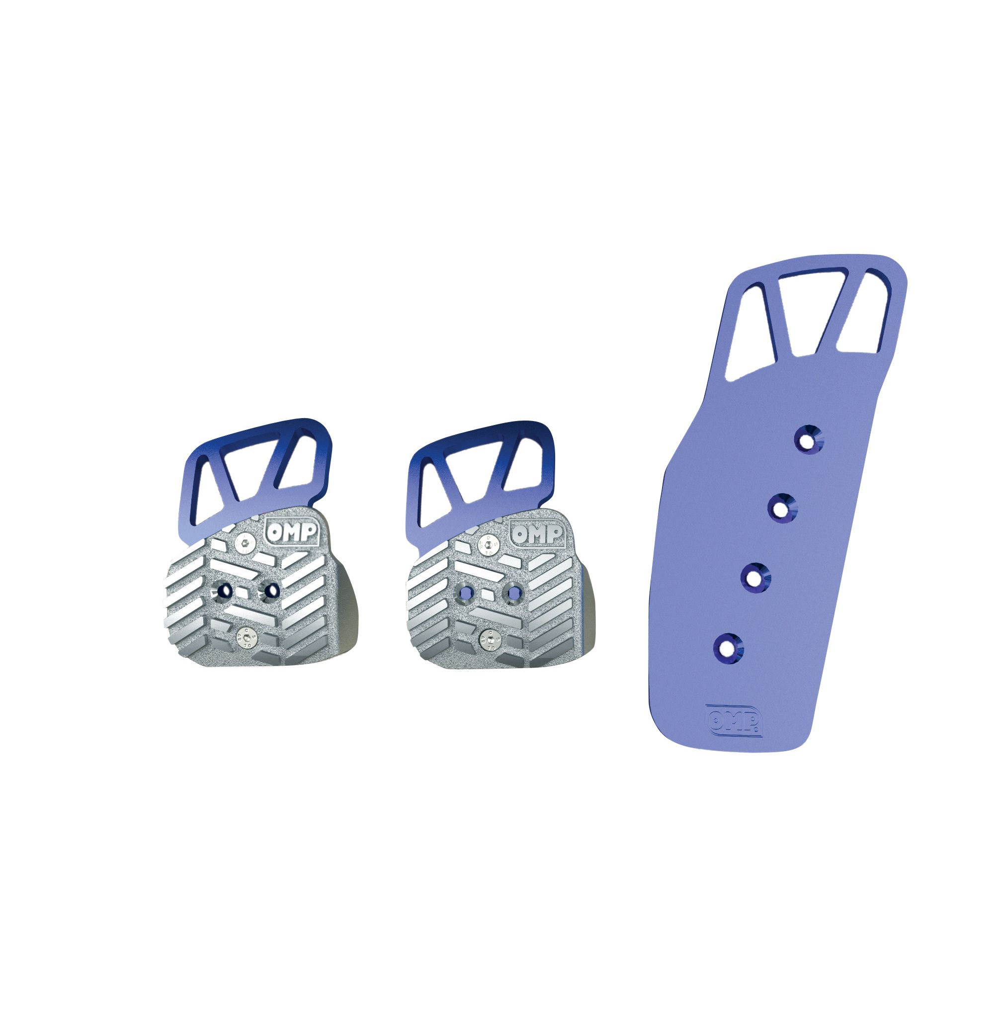 Zestaw nakładek na pedały OMP do manualnej skrzyni biegów (3 szt.), wykonane z aluminium, długi pedał gazu, zestaw stalowych śrub w komplecie. Dostępne w 3 kolorach: srebrnym, niebieskim i czerwonym.